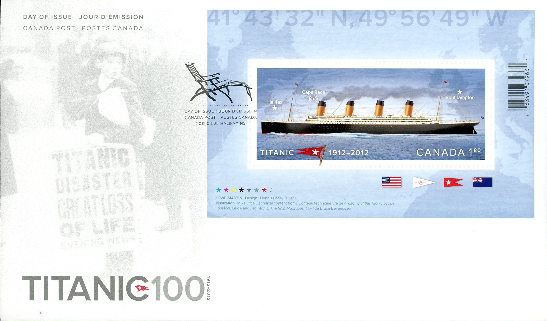 Canada FDC#2535 – Titanic, Map of North Atlantic, Flag of the White Star Line (2012) $1.80