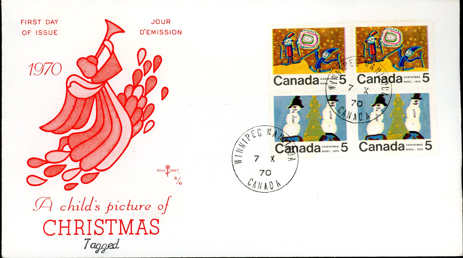 Canada FDC-BLOCK#522p+52piii+2x523p – Christmas (1970) 5¢ WCB