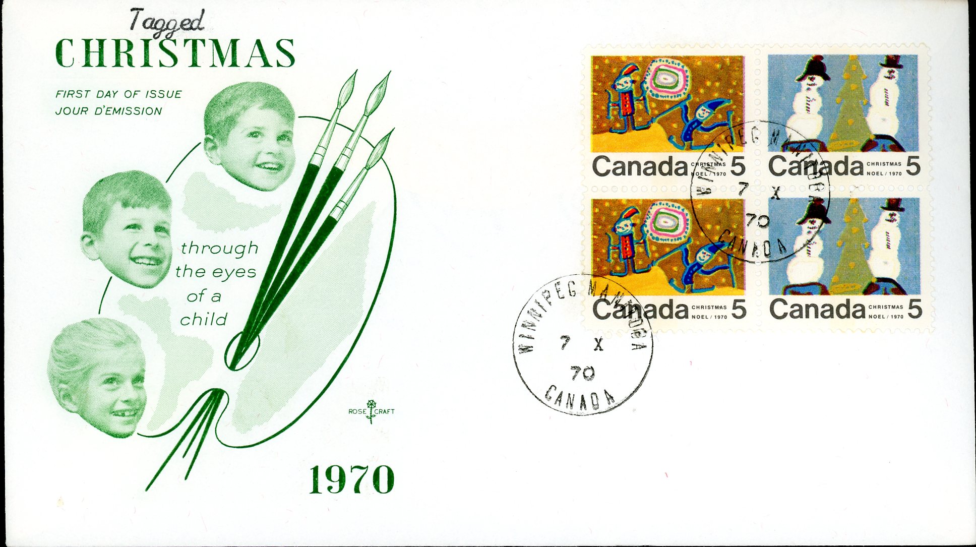 2x Canada Stamp #523p – Snowmen and Tree (1970) 5¢ WCB