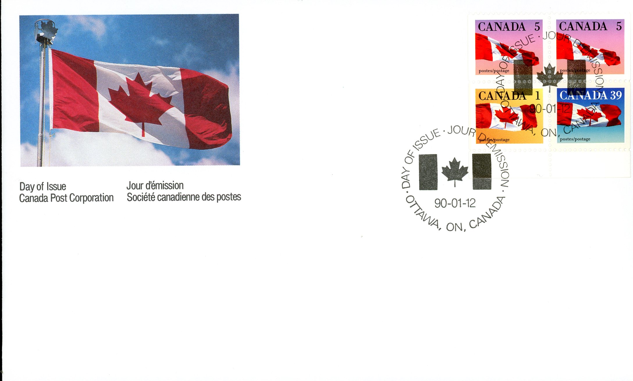 Canada FDC#1189a – Canada Flag (1990) 1 x 1¢, 2 x 5¢, 1 x 39¢
