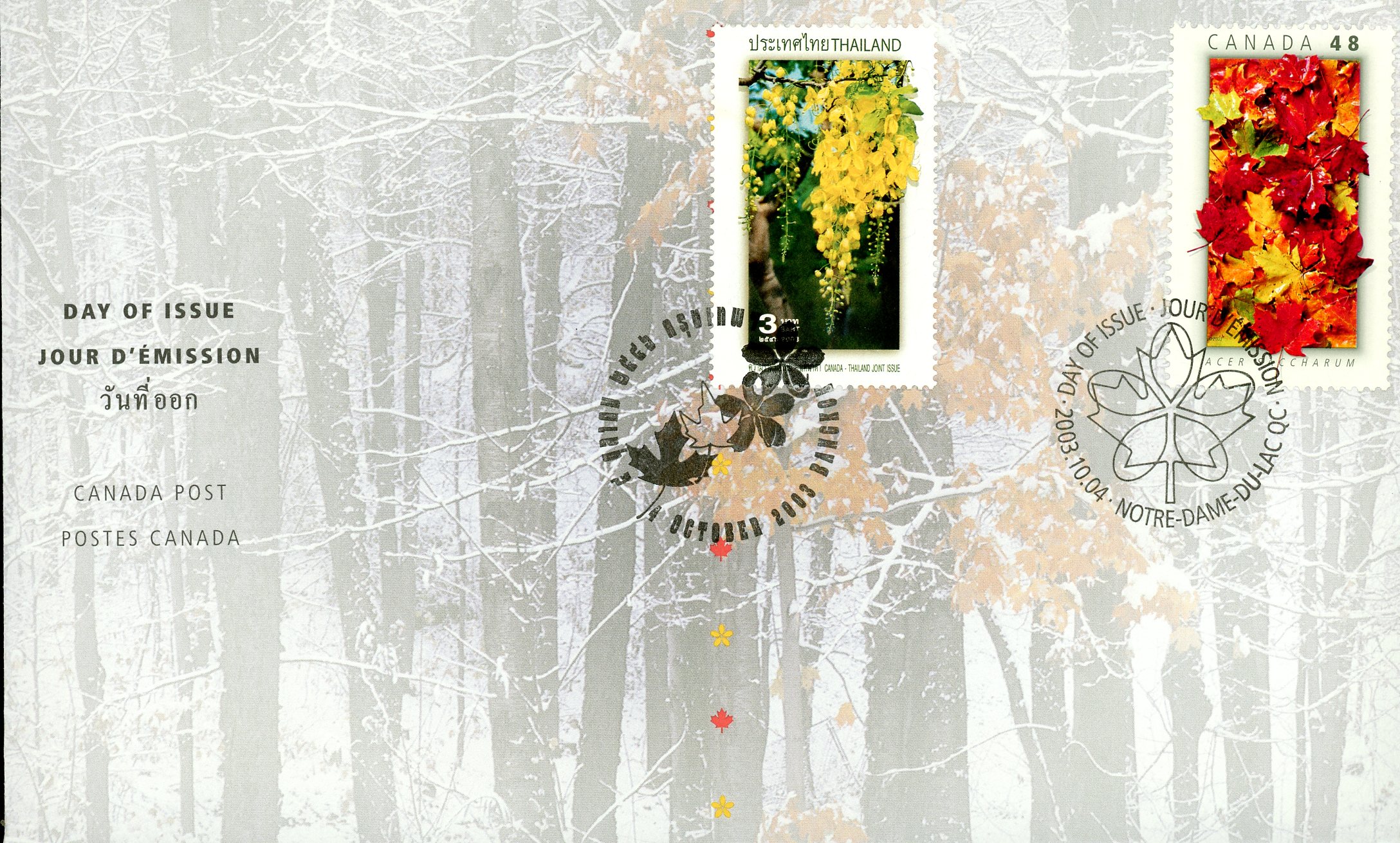 Canada FDC#2001a w/Thailand #2090 – JOINT ISSUE – National Emblems (2003) 2 x 48¢ Se-tenant pair (2000, 2001)