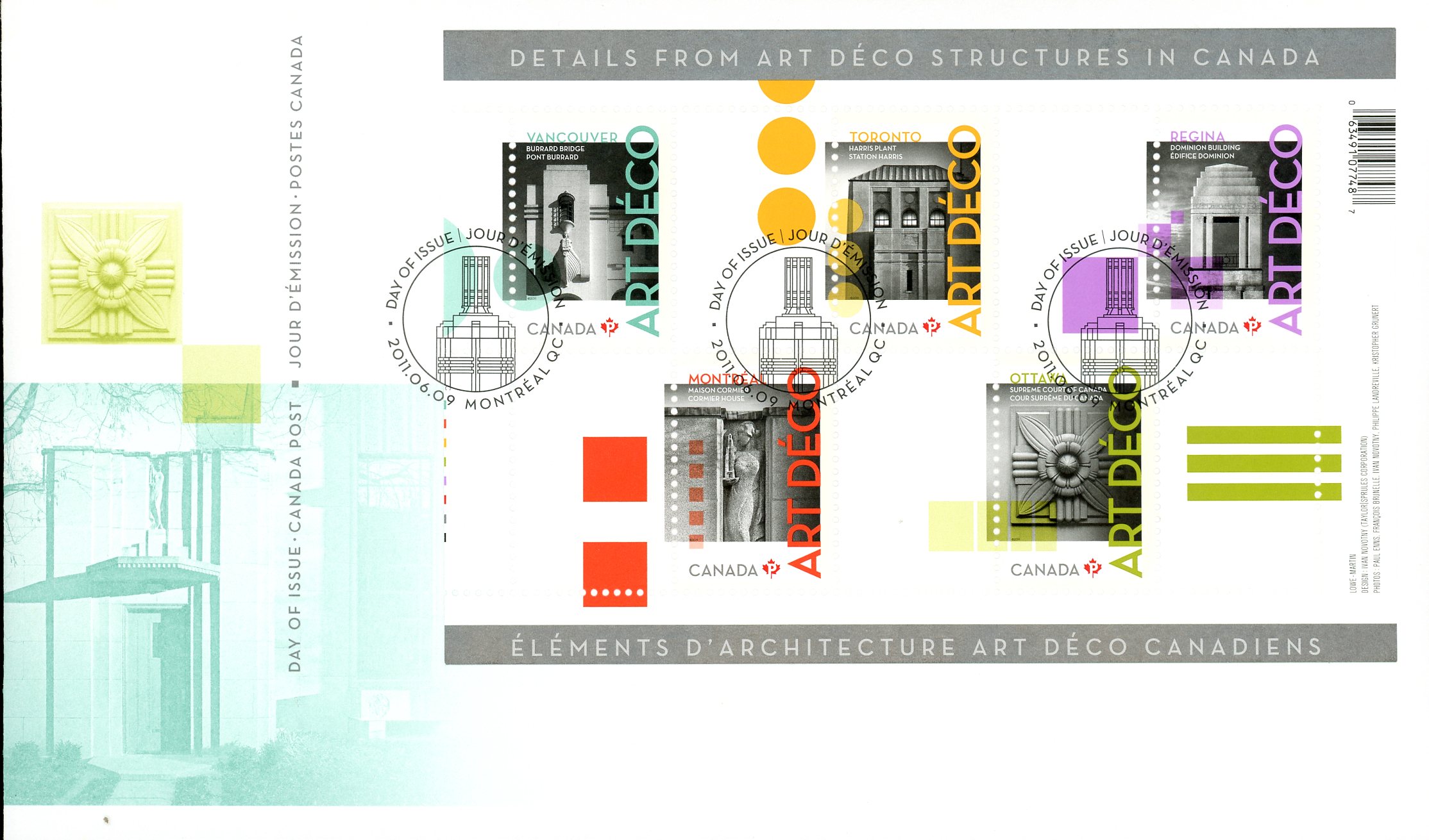 Canada FDC#2471 – Architecture: Art Déco (2011) 5 x P (59¢) Souvenir sheet of 5