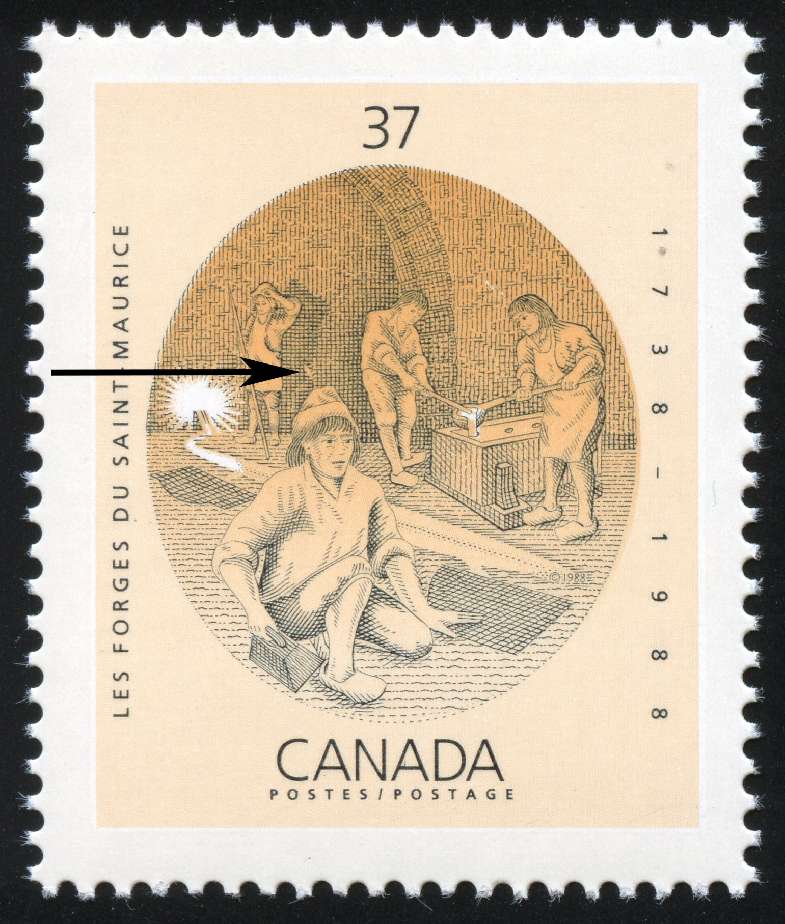 Canada Stamp #1216i – Ironworks blast furnace (1988) 37¢ “feather in cap” variety