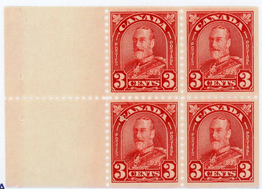 Canada Stamp #167a – King George V (1931) 4 x 3¢ Booklet pane of 4 stamps (#167as) (BK18, BK19) + 2 labels (GRADE VF-MLH)
