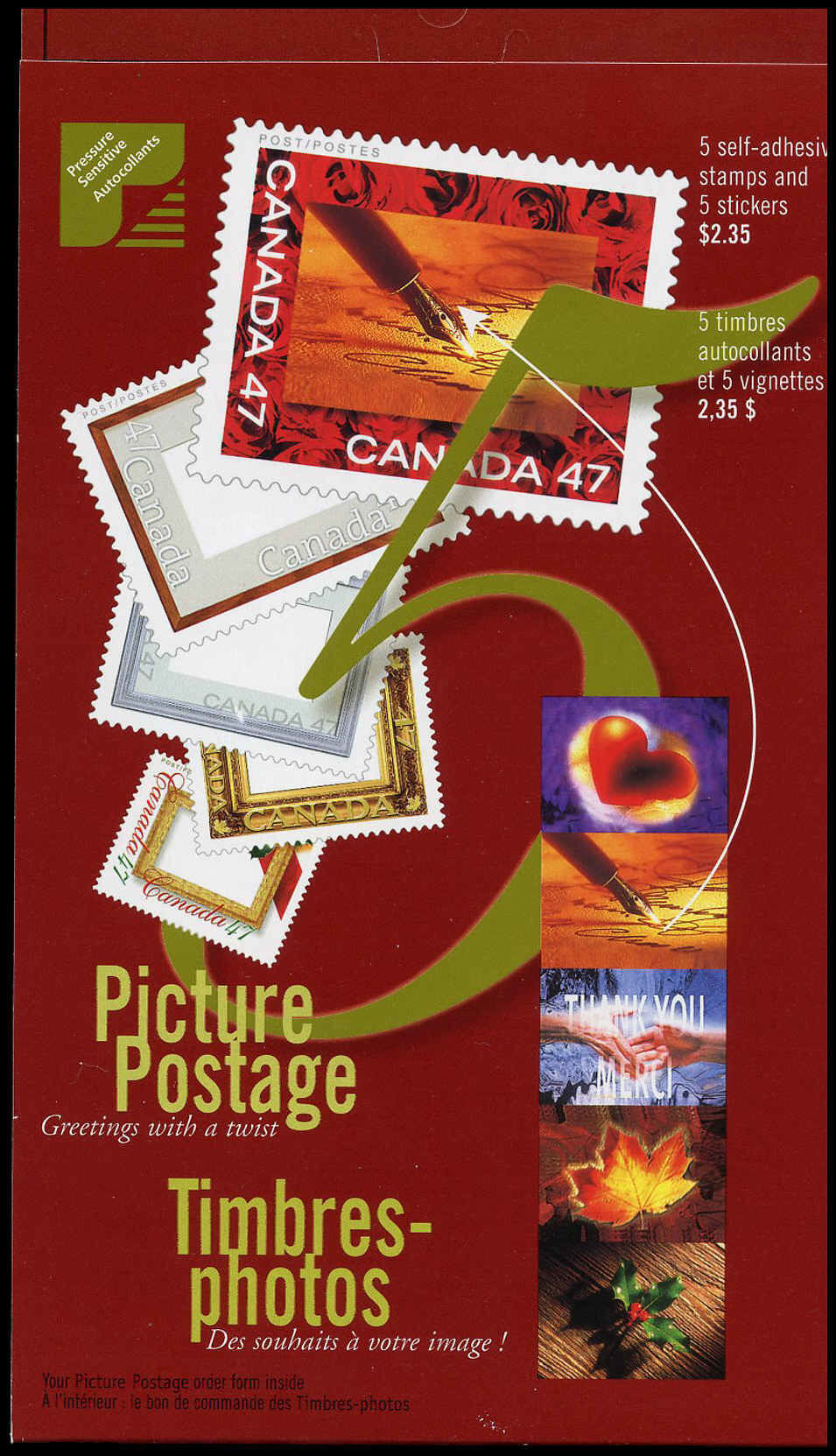 Canada Stamp #1882 – Picture Postage (2000) 5 x 47¢ Booklet pane of 5 stamps (#1882a-e) (BK240) + 5 stickers