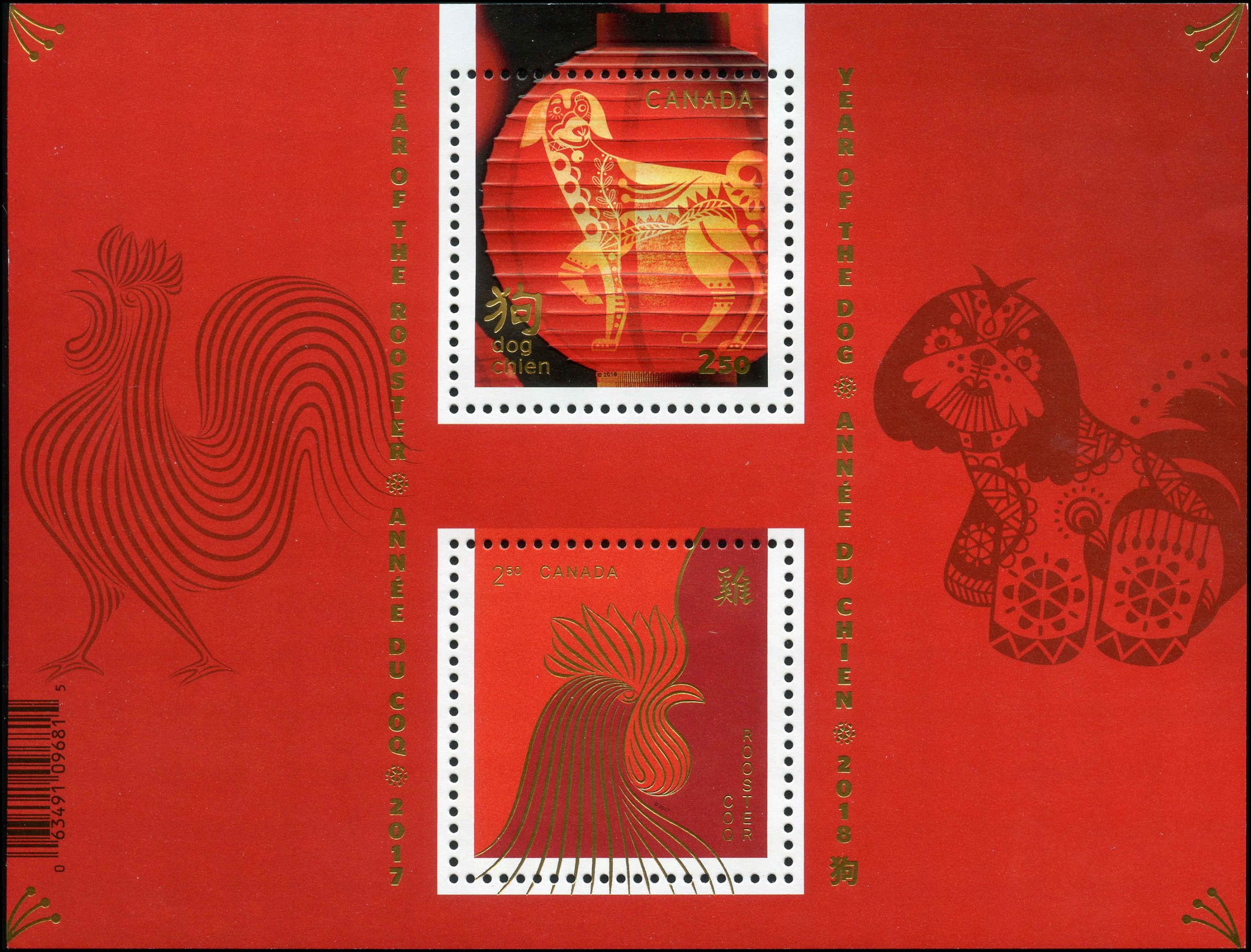 Canada Stamp #3053a – Year of the Dog (2018) $5 Souvenir sheet of 2 (2960, 3054)