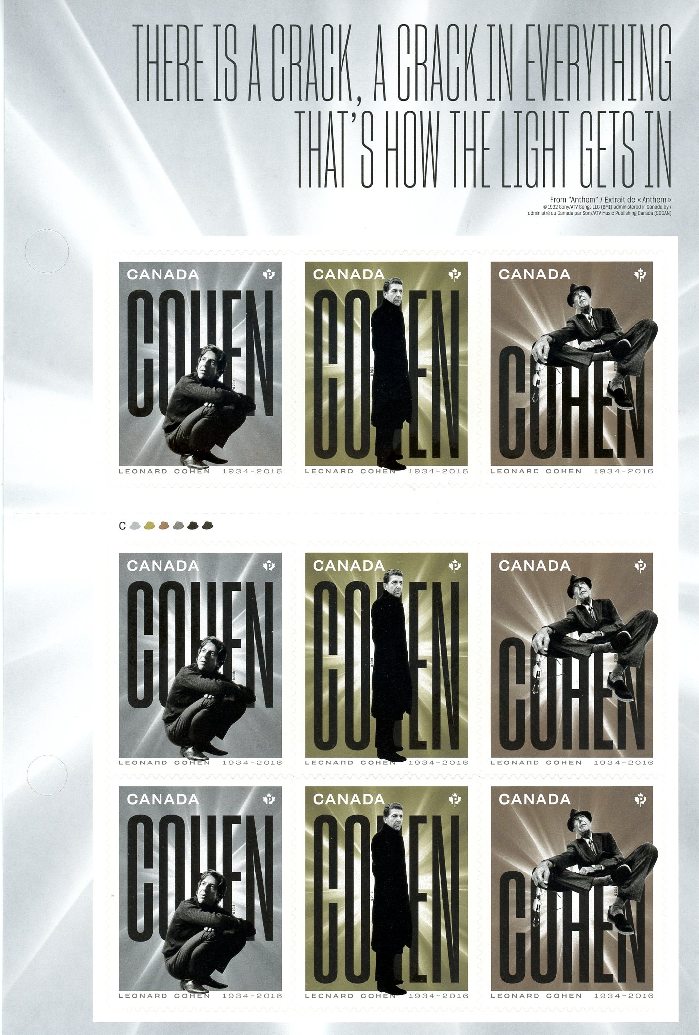 Canada Stamp #3198a – Leonard Cohen (2019) 9 x P (90¢)