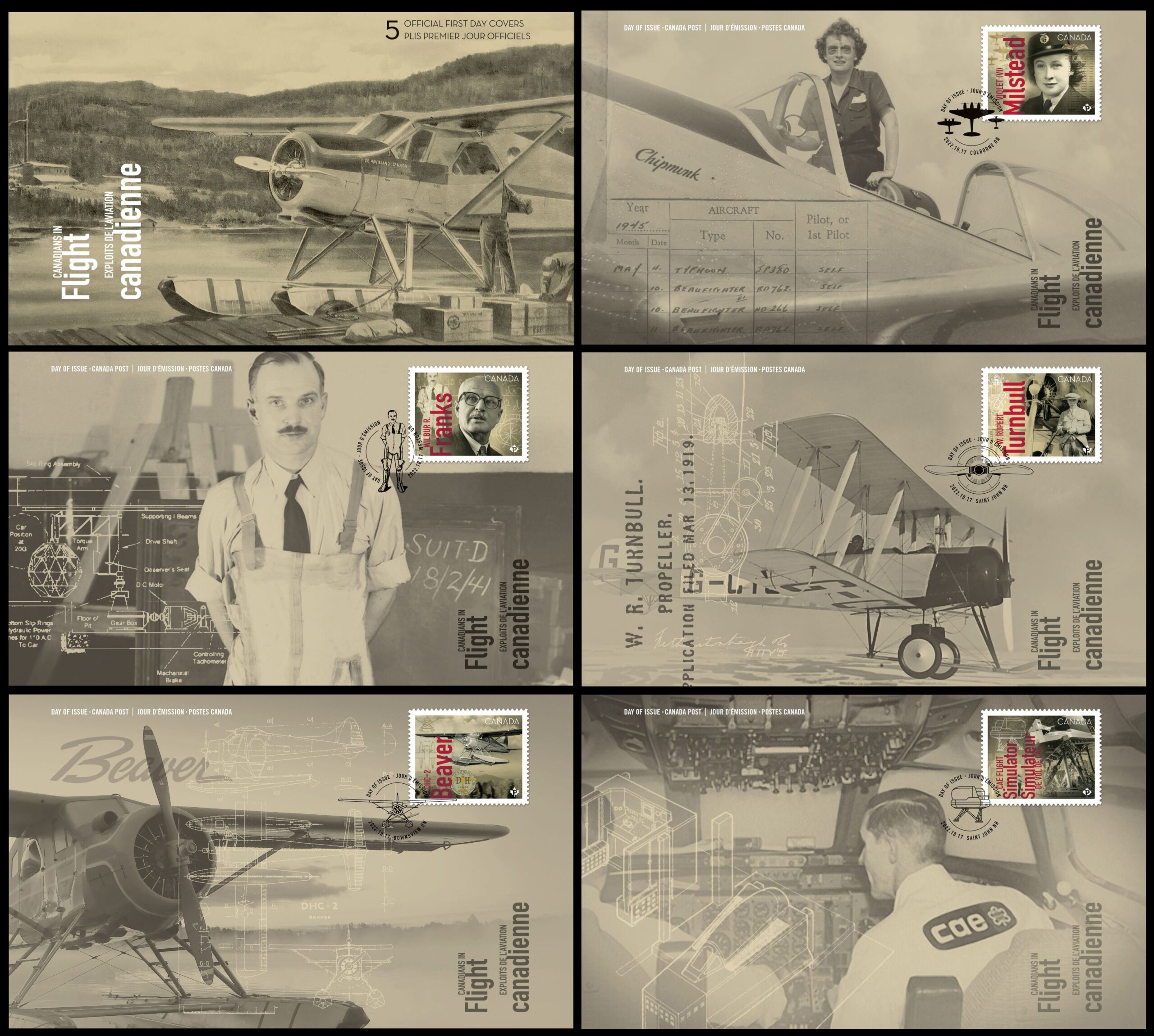 Canada Stamp #3356-60-FDC – Canadians in Flight (2022) 5 x P (92¢) Set of 5 official first day covers in envelope