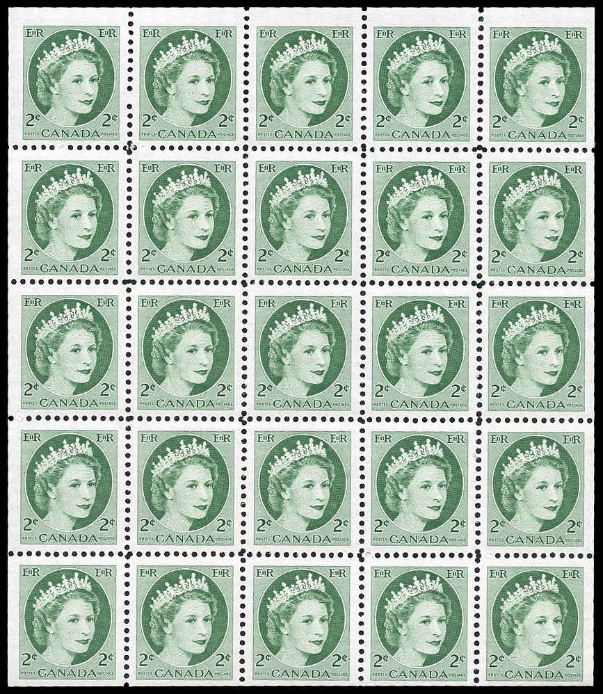 Canada Stamp #338a – Queen Elizabeth II (1954) 25 x 2¢ Miniature Pane of 25