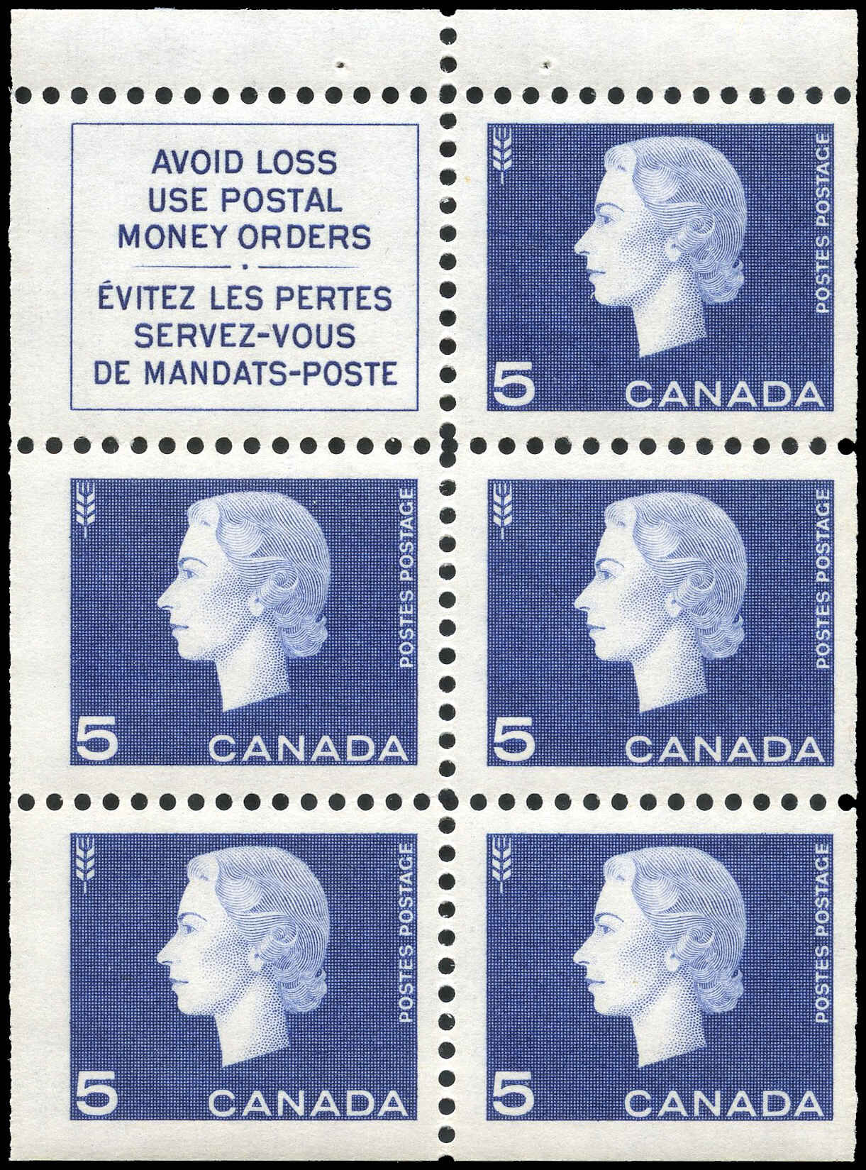 Canada Stamp #405a – Queen Elizabeth II (1962) 5 x 5¢ Booklet pane of 5 x 5¢ (405as) + label