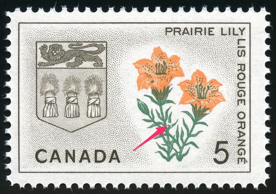 Canada Stamp #425ii – Saskatchewan, Prairie Lily (1966) 5¢ “Broken Leaf” (pos. 9, LL)