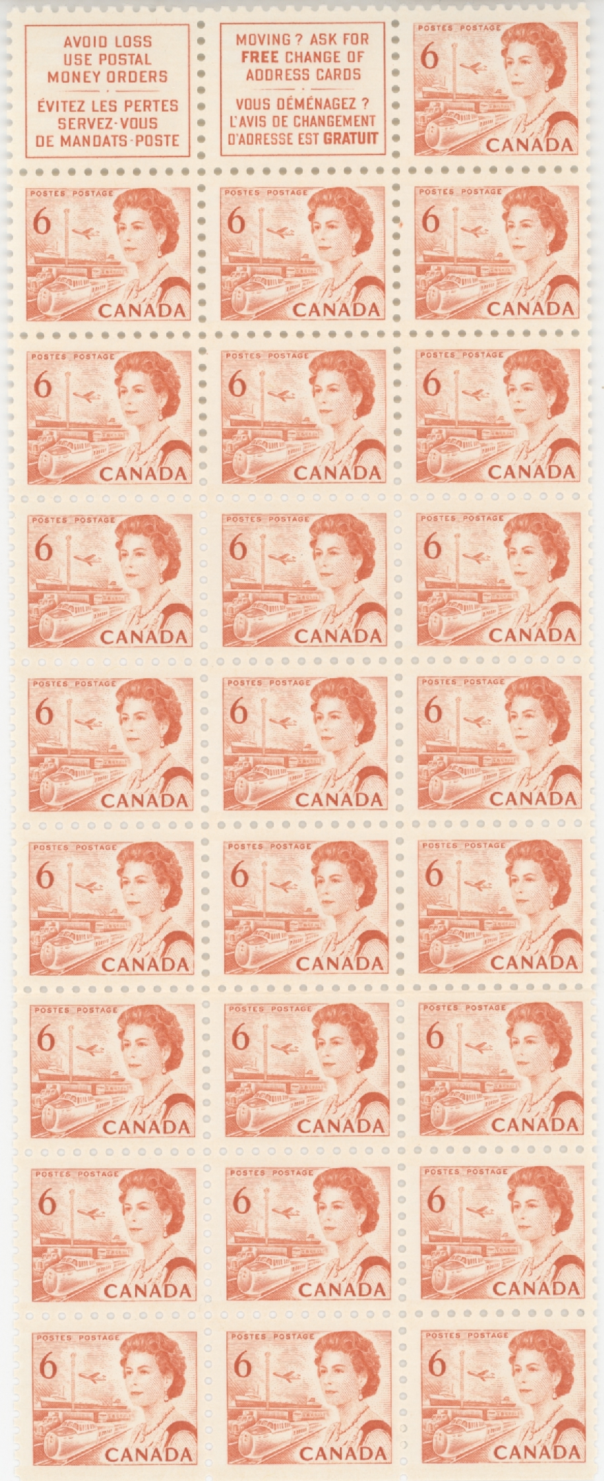 Canada Stamp #459a – Queen Elizabeth II & Transportation (1968) 25 x 6¢ Booklet pane of 25 stamps (#459 and 459as) (BK60) + 2 labels, NF