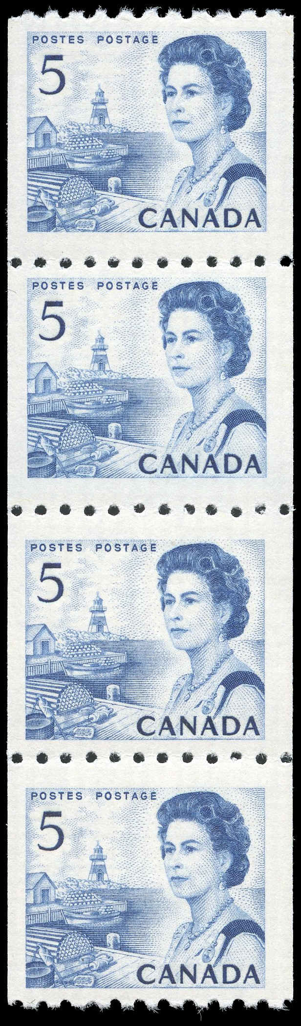 Canada Stamp #468iii – Queen Elizabeth II (1967) 4 x 5¢ END strip of 4, LF/fl, DEX
