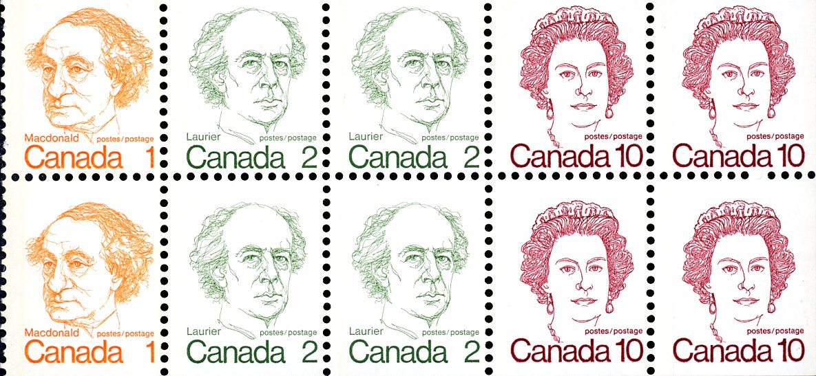 Canada Stamp #586c – Sir John A. MacDonald (1976) 2 x 1¢, 4 x 2¢, 4 x 10¢ Booklet pane of 10, dull fluorescence
