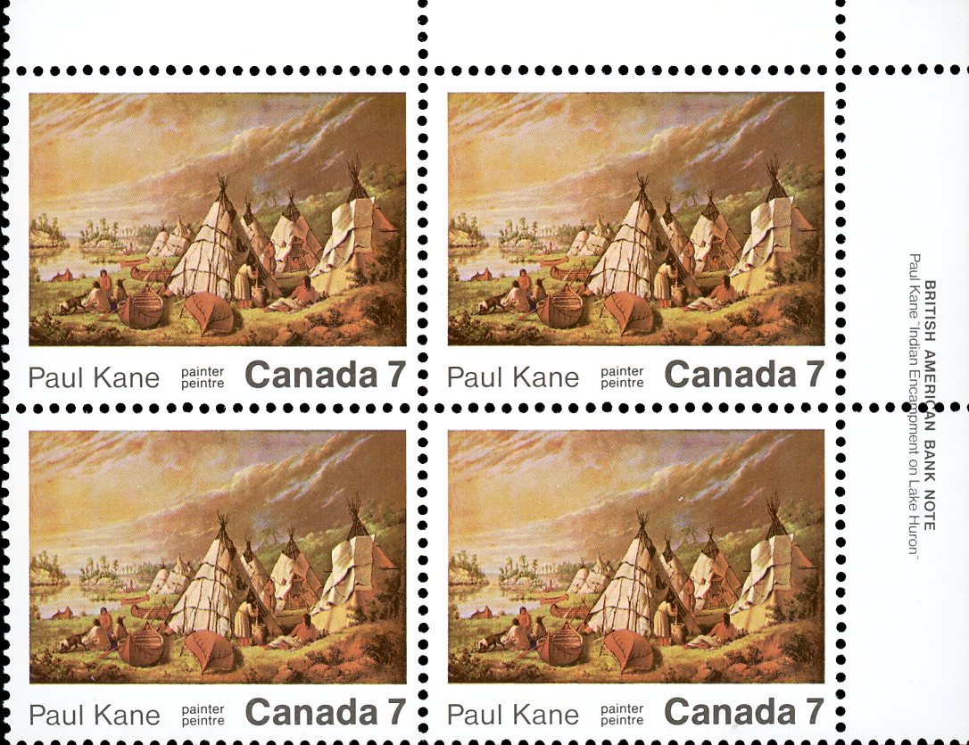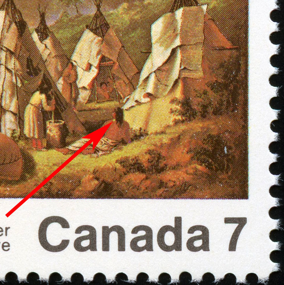 Canada Stamp PB#553iii – Indian Encampment on Lake Huron (1971) 7¢ Burr over shoulder variety (pos. 9)