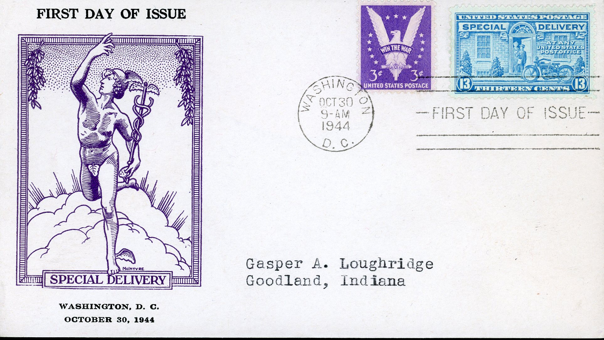 US FDC Special Delivery #E17 – Postman and Motorcycle (1944) 13¢
