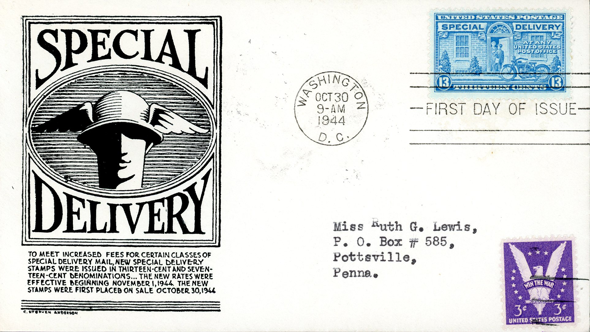 US FDC Special Delivery #E17 – Postman and Motorcycle (1944) 13¢