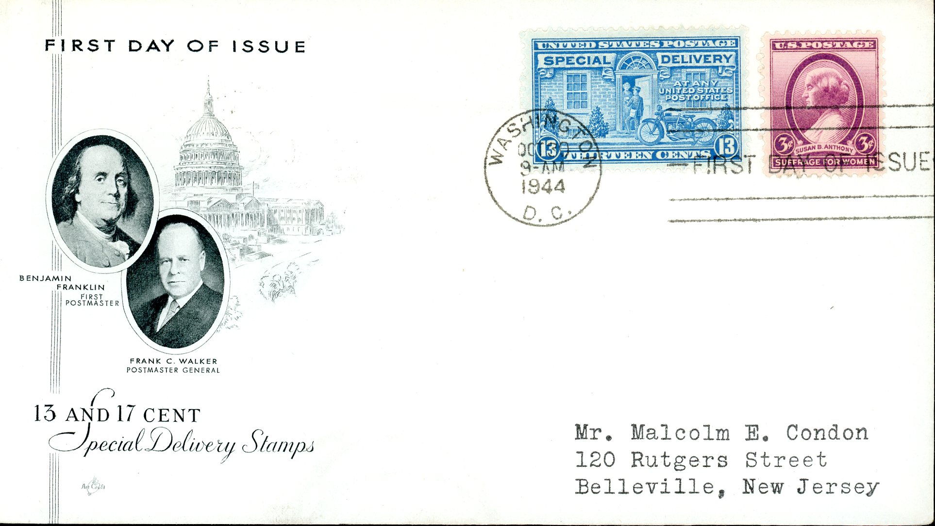 US FDC – Special Delivery #E17 – Postman and Motorcycle (1944) 13¢